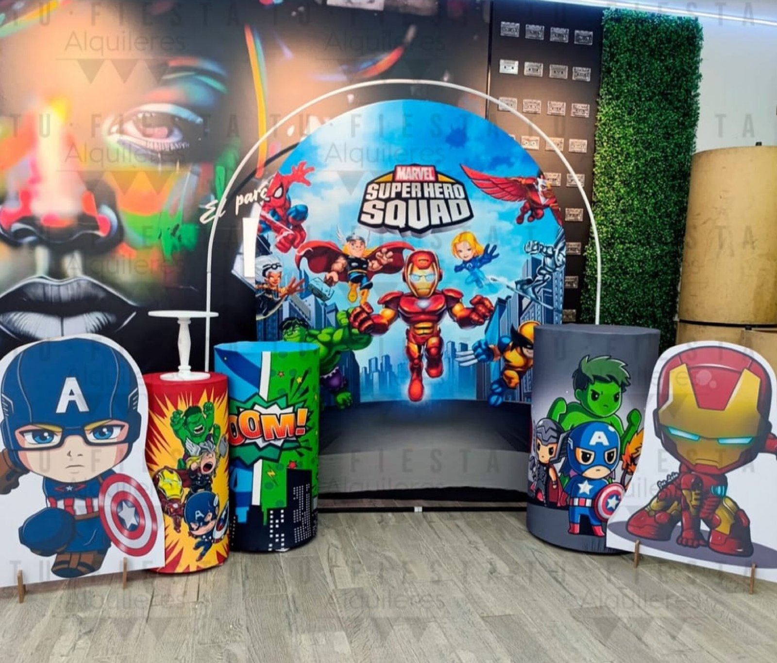💥 Alquila Set Marvel Superhéroes: Decoración completa (fondo, figuras, bases) para una fiesta épica. ¡El photocall que tus niños amarán!